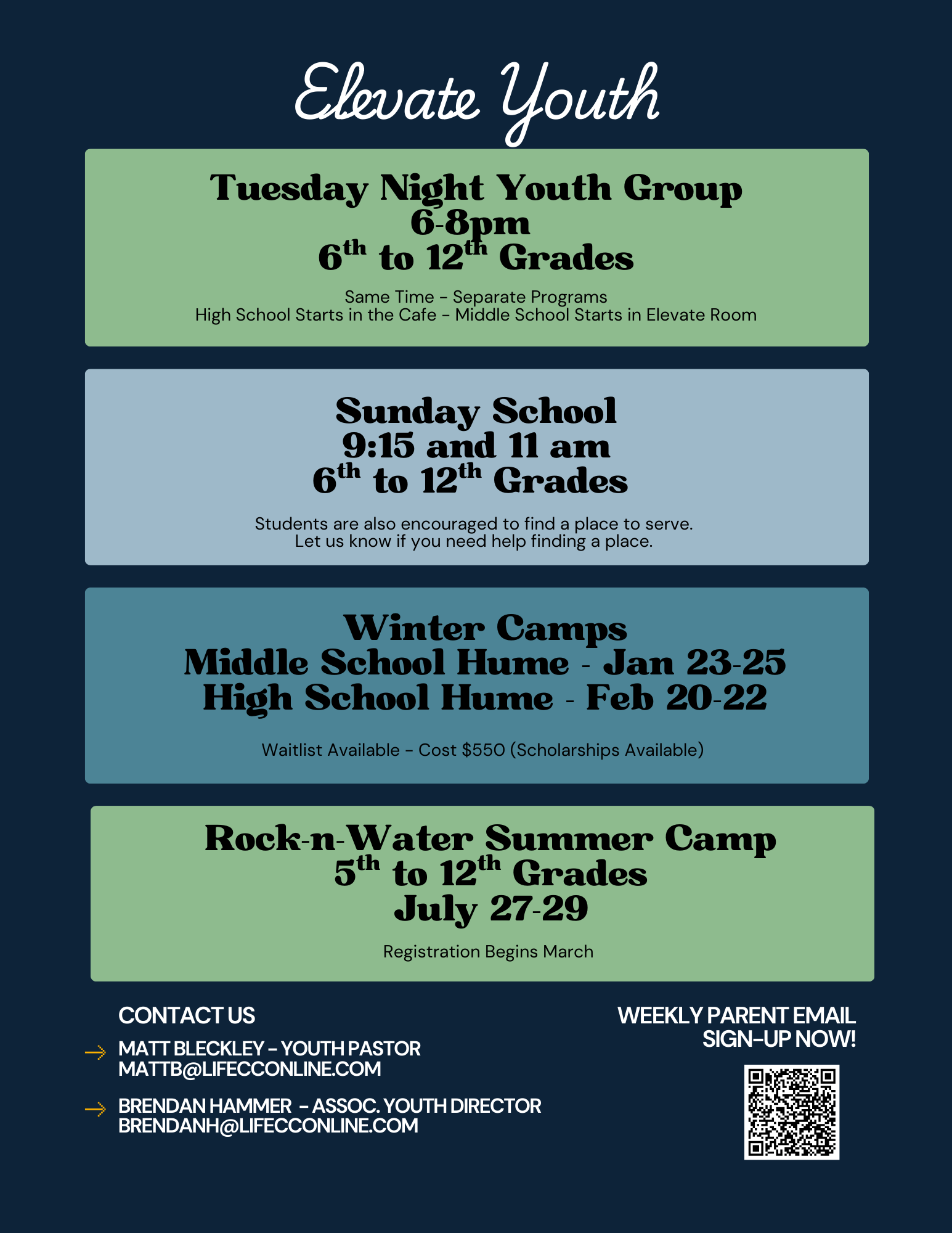 To experience God’s Welcome in a safe and fun community where Jesus and his Word is at the center of informing our identity, where students are inspired by the Wonder of God, and where We are transformed through relationships with God and others to live out the Work of the kingdom.